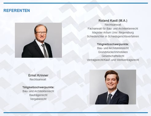 beide beraten seit vielen Jahren schwerpunktmäßig im Bau- und Architektenrecht, seit neuestem auch unsere Verbandsmitglieder in der kostenfreien Erstberatung.
